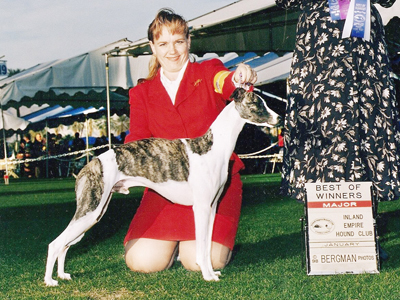 It's hard to believe we looked for our first racing Whippet 15 years ago, and she never disappointed us. No, she was never an A dog or a race champion, but she was a champion in our hearts. She was rarely beaten out of the box, we think she went under the door, since she was so small. 18 1/2 inches, racing weight 21 lbs, and hell on wheels for 100 yards. Our little pocket rocket.