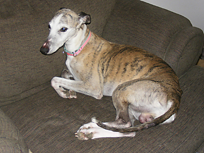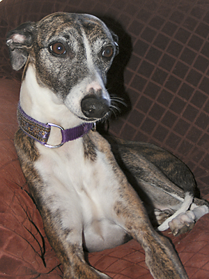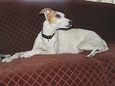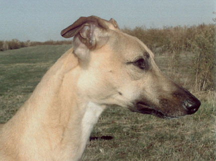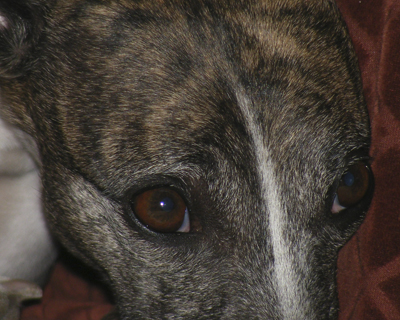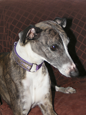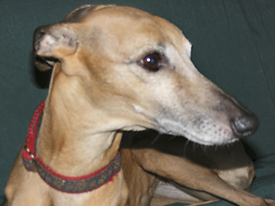 Bayberry's Sam I Am, CRX VIII, WRCh & AKC Ch Ptd (Galeforce Tilt O'Whirl, RCh, SORC, FCh ex Ch Allerei's The Cat's Meow). Sam was our first Myles' son and he has accomplished what few whippets can, he is racing championship (WRA) and show championship pointed (AKC Ch), his first show weekend out (at 6 months and 3 days of age) he received his first show win and went on to take Best of Breed over several top specials. His last show, at 7 years of age, he received reserve to a major out of the open class. He has shared his loving heart with his "Aunt Mary" who showed him for us, and whom he totally wooed over with his charm and good looks (he even has a page on her SaeSi website). Sam sired our 2004 litter (Ashe, Beamer & K.I.A.) out of Dawn. He is owned by us and co owned with Mary's son, Patrick Magee. Bred by Julie Ward. Myostatin N/N